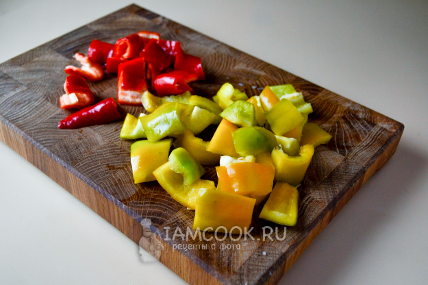 Сладкие перцы разрежьте, удалите семена и нарежьте небольшими кусочками.