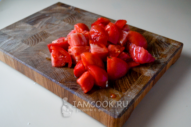 С помидоров снимите кожицу и нарежьте средними кусочками.