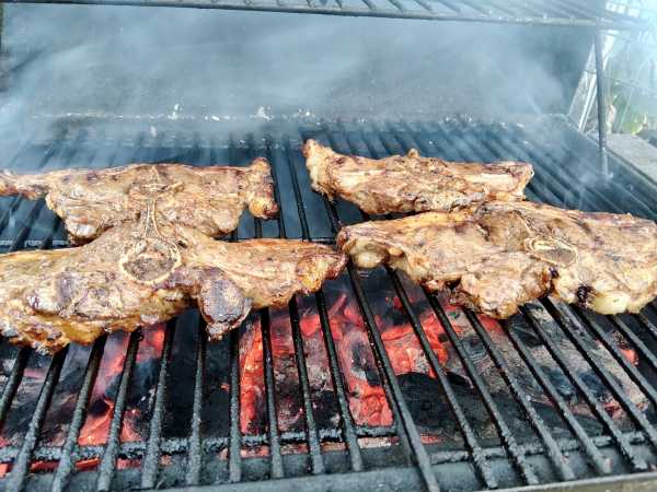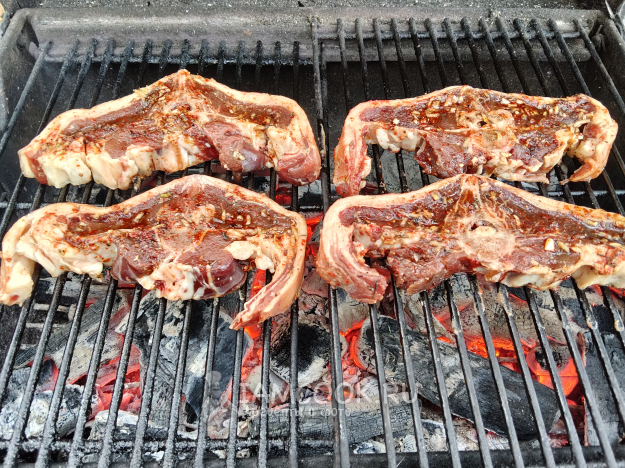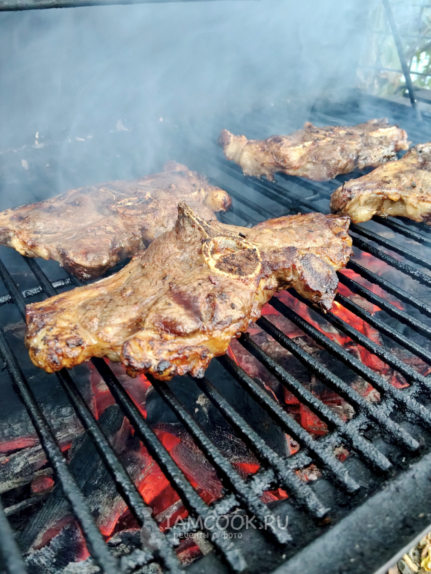 Жарить стейк из баранины на мангале, переворачивая, до румяного состояния с обеих сторон.