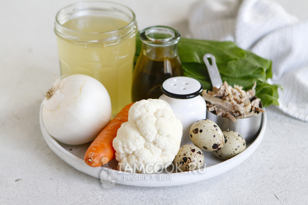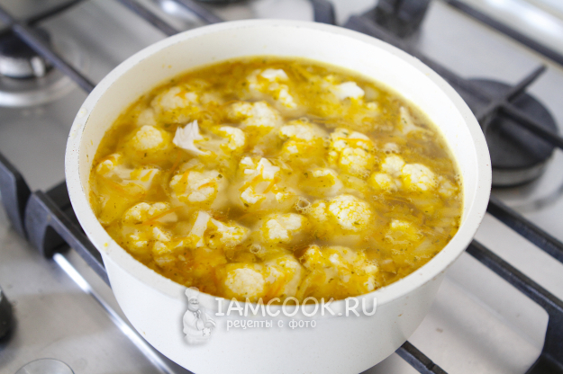 Готовый бульон перелейте в кастрюлю и доведите до кипения. Добавьте в него обжаренный лук с морковью и цветную капусту, и кусочки мяса.