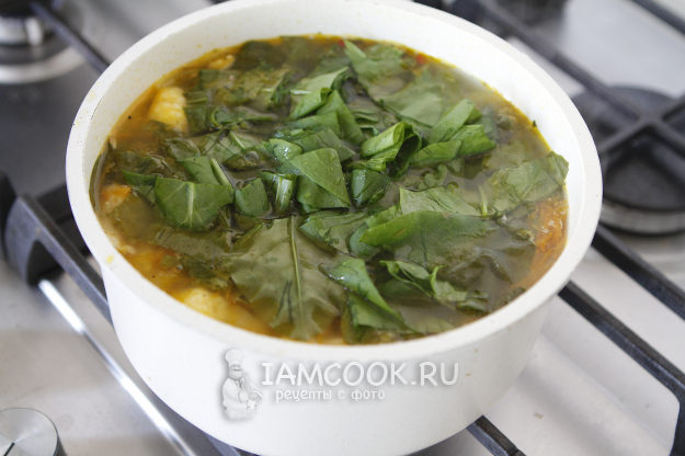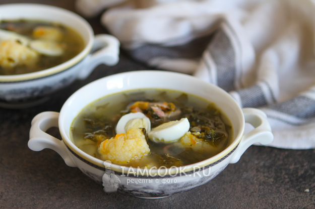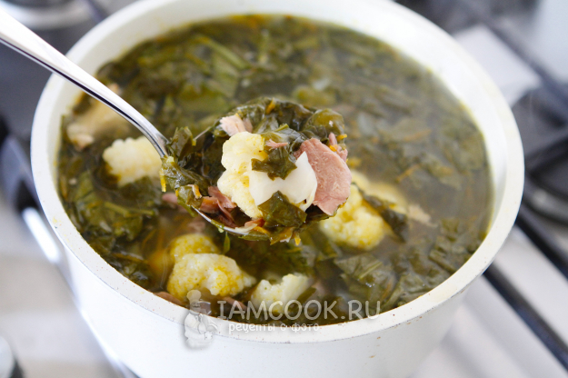 Примерно через 7 минут, как только цветная капуста будет готова, добавьте щавель. Дайте покипеть 3-4 минуты.
