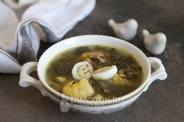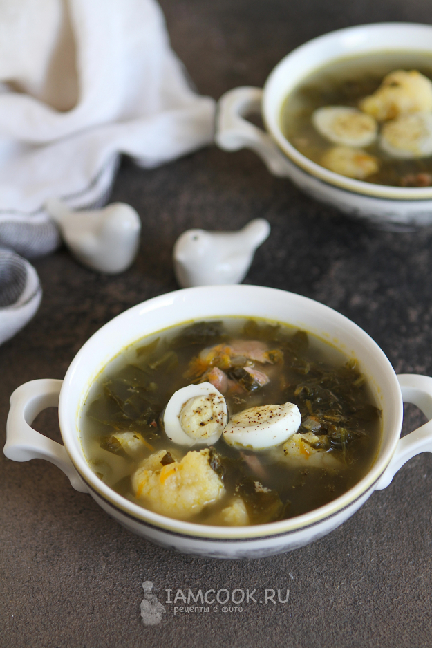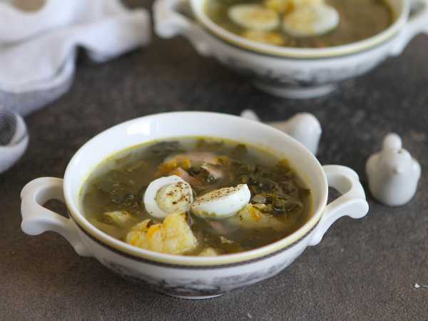 Суп разлейте по тарелкам. Добавьте половинки перепелиных яиц. Подавайте щавелевый кето суп со сметаной.