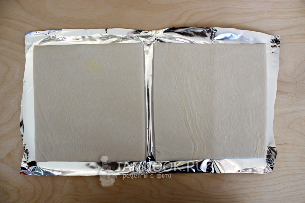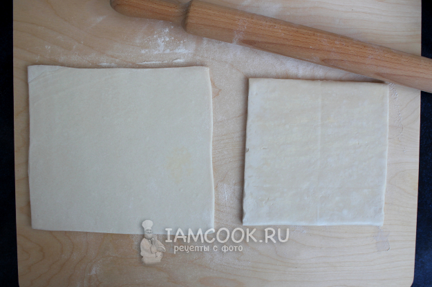 Каждый лист слоёного теста несколькими аккуратными движениями раскатайте в заготовку немного побольше.