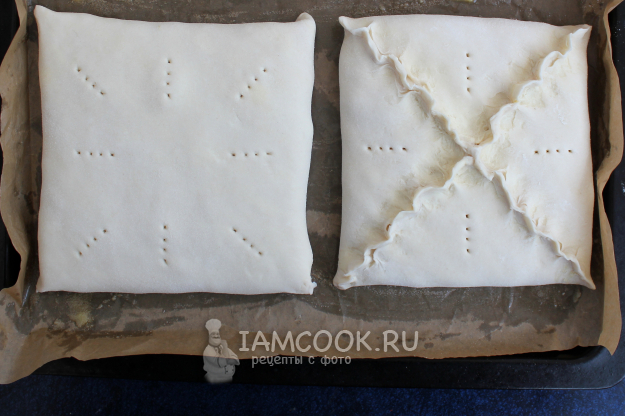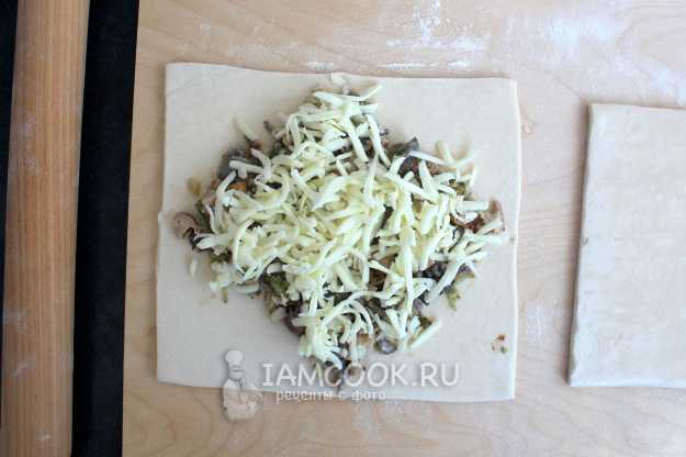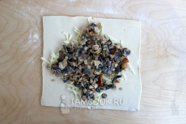 Для варианта с защипыванием сверху уложите на тесто сначала курино-грибную начинку, а затем укройте её сыром. Соедините углы теста к центру, придайте заготовке форму квадрата и защипните. Положите заготовку на смазанный или проложенный пекарской бумагой противень.
