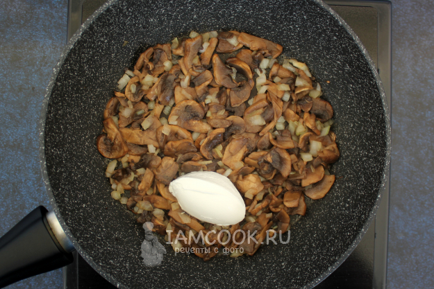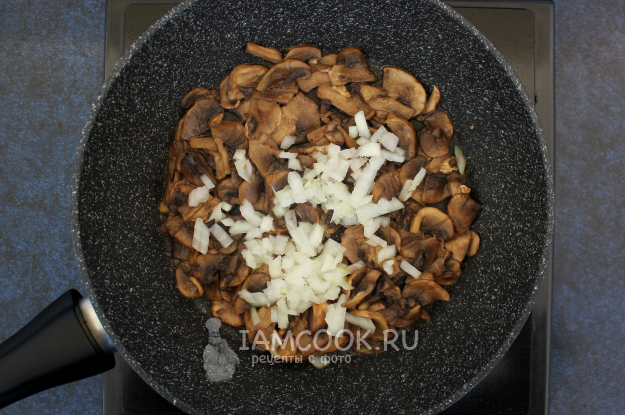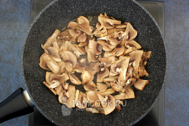 Шампиньоны для начинки тонко нашинкуйте и обжарьте в течение 3-4 минут на сильном огне помешивая.