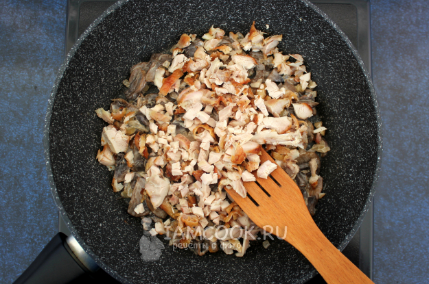 Соедините эту грибную часть с куриным мясом. По желанию во всю или в часть начинки добавьте тертый или нарезанный консервированный огурчик в количестве – по вкусу.