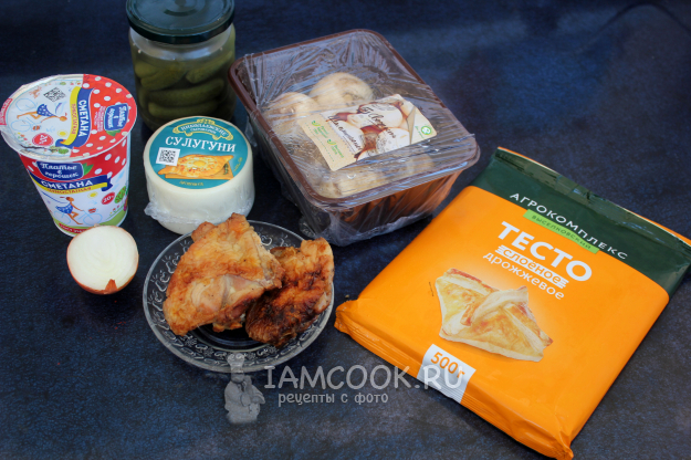 Для варианта пирога Сокоти с курицей и грибами подготовьте ингредиенты по списку к рецепту. Куриное мясо подходит любое и приготовленное любым способом (жареное, запеченное, отварное). Тут – остатки шашлыка из куриных бёдрышек. Сметану можно заменить сливками. Консервированные огурчики добавила только в один из двух пирогов, чтобы было и так, и эдак.
