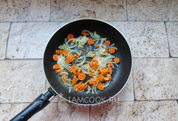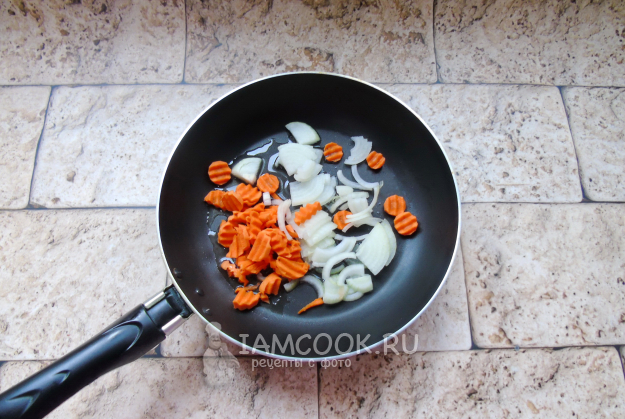 А пока картошка с гречкой варятся, репчатый лук и морковь очистите, помойте. Нарежьте произвольно и выложите в сковороду с растительным маслом.