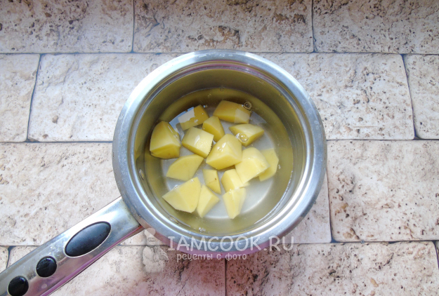 Картошку очистите, помойте и нарежьте. Выложите в кастрюлю с толстым дном и залейте водой.