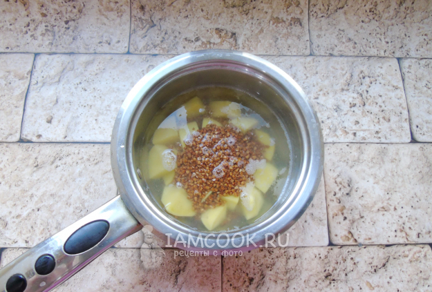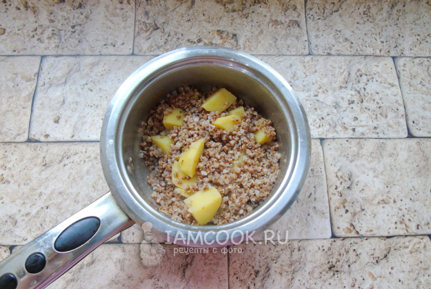 Гречку, если нужно, переберите и хорошо промойте в воде. Добавьте в кастрюлю с картошкой. Посолите по вкусу.