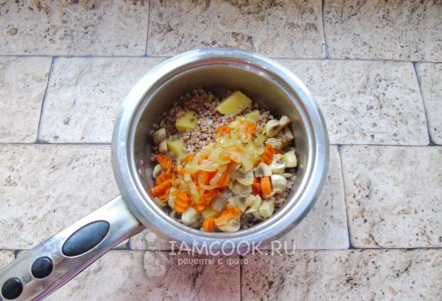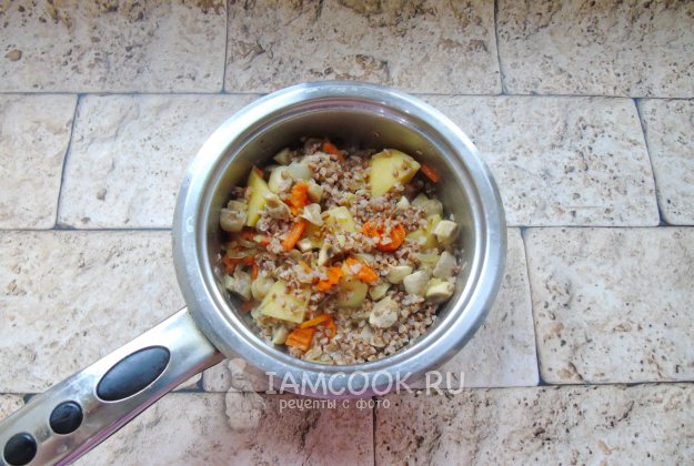 Варите до готовности картошки и гречки. Вода должна полностью выкипеть.