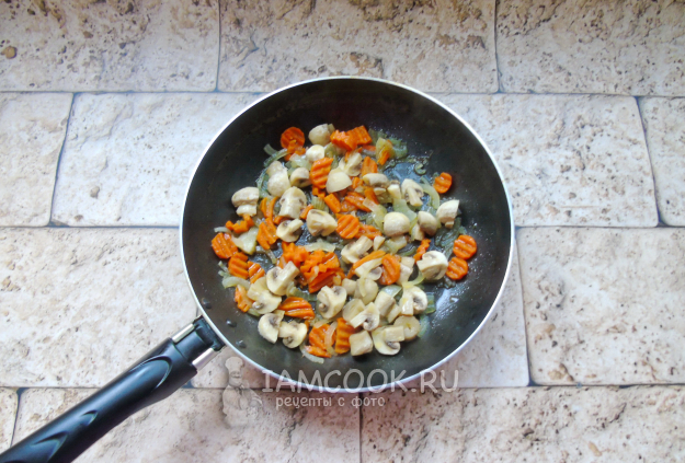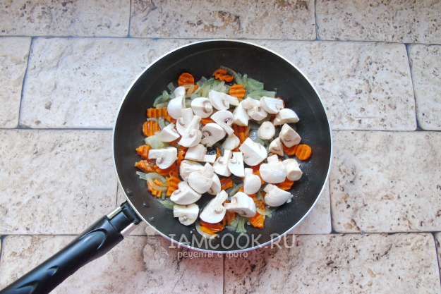 Шампиньоны очистите, нарежьте и добавьте к луку и моркови.