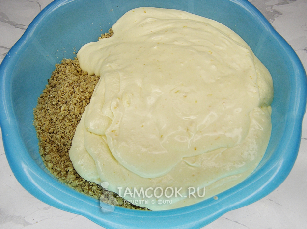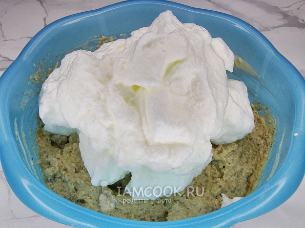 В отдельной миске взбиваем яичные белки со щепоткой соли до пышной пены, затем добавляем белки в приготовленное ореховое тесто и аккуратно перемешиваем ложкой или лопаткой.