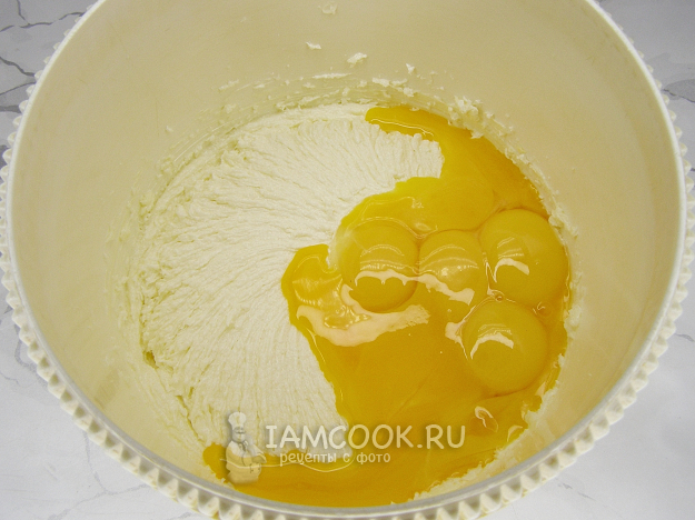 Желтки отделяем от белков и перекладываем желтки в сахарно-масляную смесь. Продолжаем взбивать миксером.