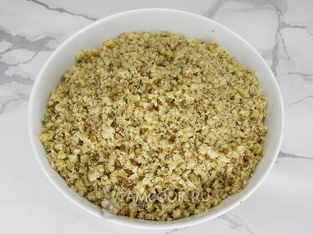 Измельчаем грецкие орехи любым удобным способом. Можно порубить их ножом, измельчить скалкой или в блендере. Орехи не должны превратиться в муку, желательно, чтобы остались маленькие кусочки.