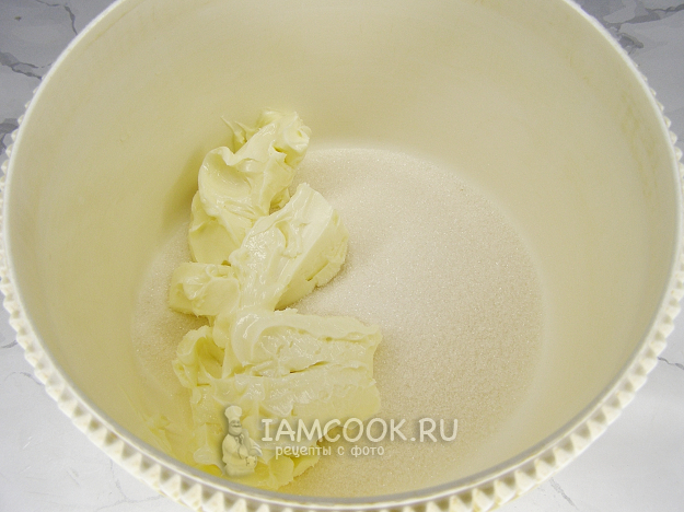 Теперь займёмся приготовлением пирога. В чашу миксера всыпаем сахар, добавляем размягчённое сливочное масло и взбиваем минут 5, пока сахар не растворится и масса не станет однородной.
