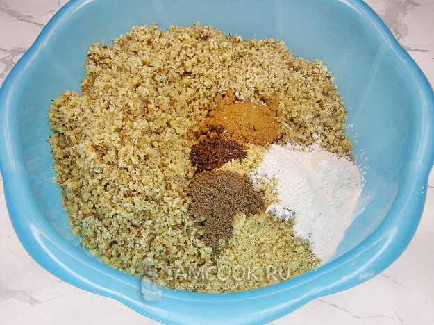 Соединяем измельчённые орехи и печенье, добавляем разрыхлитель, молотые мускатный орех, гвоздику и корицу. Перемешиваем всё ложкой.