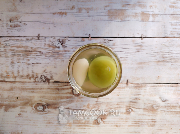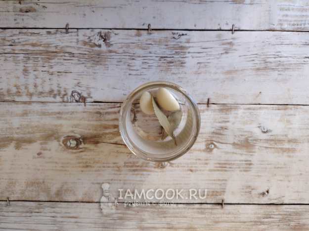 На дно посуды поместить очищенные от пленочки зубки чеснока, лавровый лист и перец.