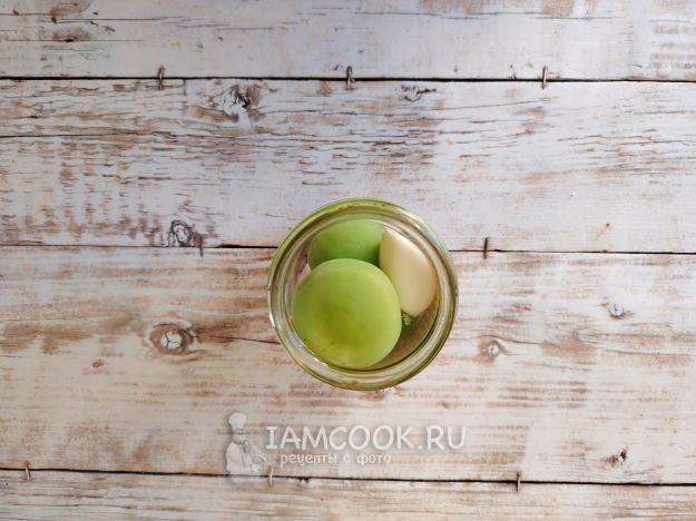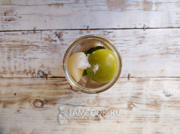 Заполнить банки промытыми зелеными помидорами. Плоды нужно брать некрупные, чтобы они аккуратно разместились в емкости.