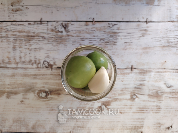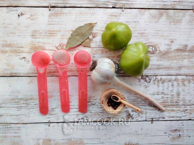 Собрать по списку продукты для приготовления острых зеленых помидоров на зиму без уксуса. Заранее подготовить банки и крышки для заготовки. Банки нужно промыть содовым раствором, простерилизовать на водяной бане, в духовке или в микроволновке. Крышки прокипятить и просушить.
