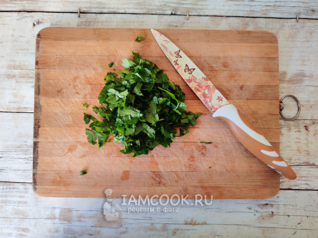 Зелень петрушки промыть, откинуть зелень на дуршлаг, когда вода стечет, мелко порубить травку ножом.