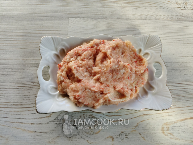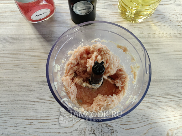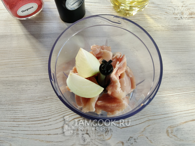 Измельчить, можно использовать мясорубку или купить уже готовый куриный фарш и измельчить в него лук.