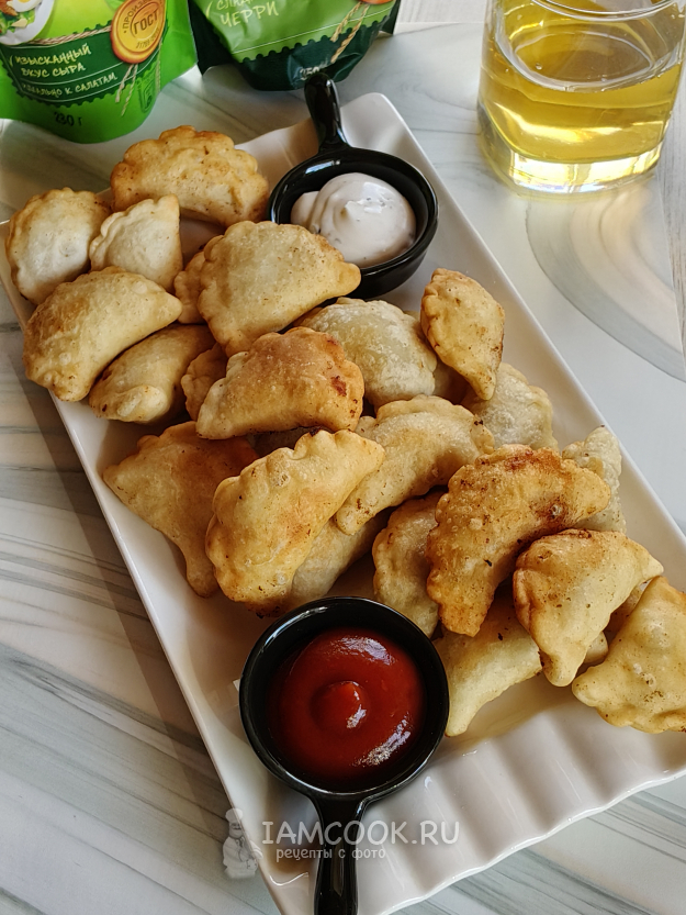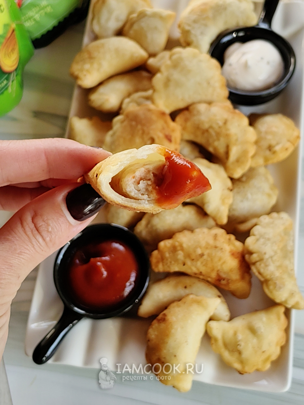 Жарить чебупели с курицей в горячем масле до румяного состояния с обеих сторон, огонь средний.