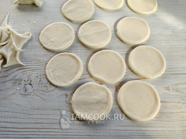 Тесто раскатать потоньше, нарезать кружочки любым стаканом.