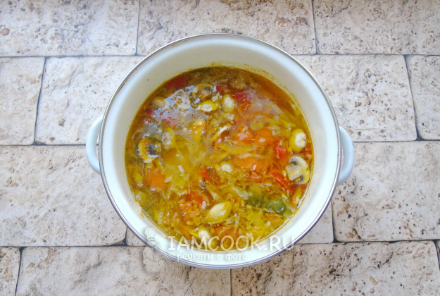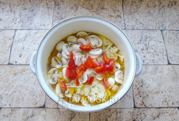 Выложите овощи и грибы в кастрюлю с супом.