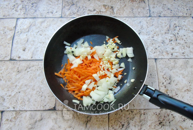 Морковь, чеснок и лук очистите, помойте. Морковь натрите на терке, а лук и чеснок мелко нарежьте. Выложите в сковороду с растительным маслом.