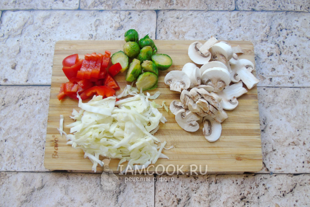 Шампиньоны очистите и нарежьте. Болгарский перец очистите от семян и помойте, нарежьте произвольно. Брюссельскую капусту помойте и разрежьте на две части. Белокочанную капусту нарежьте соломкой.