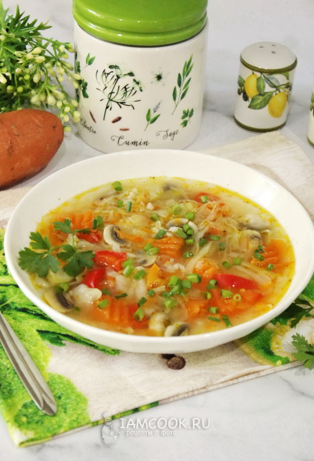 Соберите ингредиенты для приготовления супа с бататом вместо картофеля.