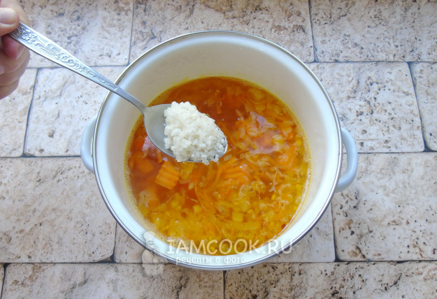 Варите овощи 10 минут, а после добавьте промытый рис.