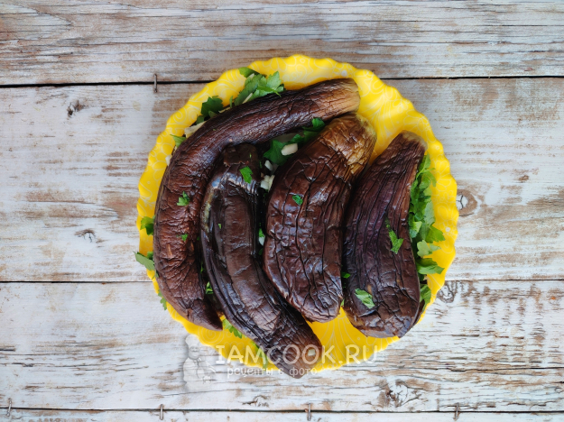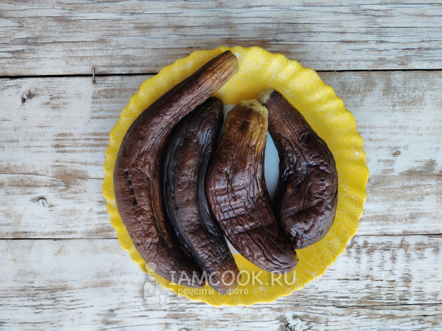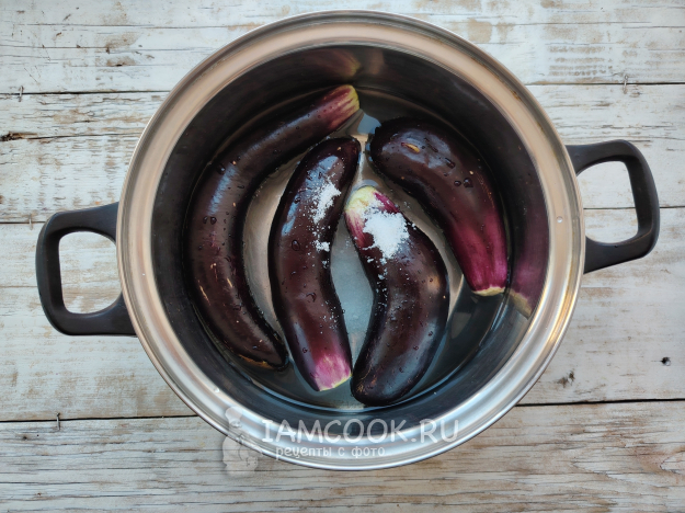У баклажанов отрезать место крепления плодоножки с листиками. Промыть плоды, поместить в кипящую воду, добавить 2 столовые ложки каменной соли, варить овощи на среднем огне в течение 8 минут, периодически их переворачивая.