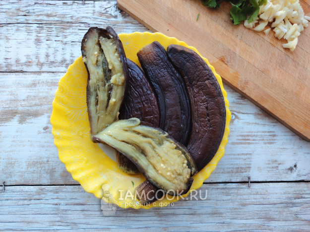 Вынуть баклажаны из отвара, дать воде стечь, переложить их в плоскую тарелку.