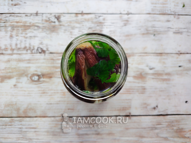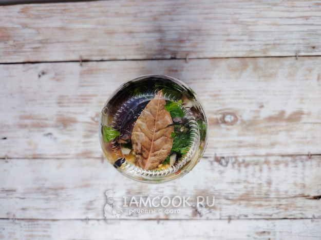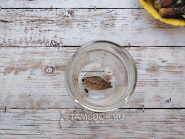 В банку на дно положить лавровый лист, перец горошком.