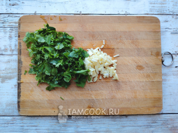 Зелень промыть, зубки чеснока освободить от пленочек, мелко порубить ножом.