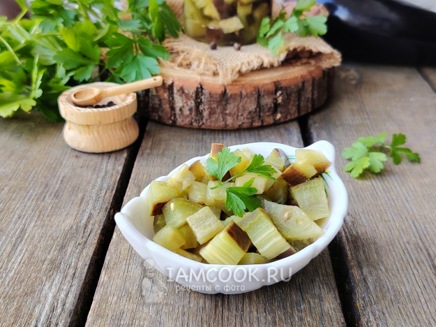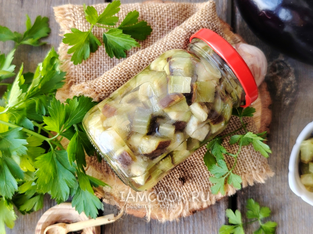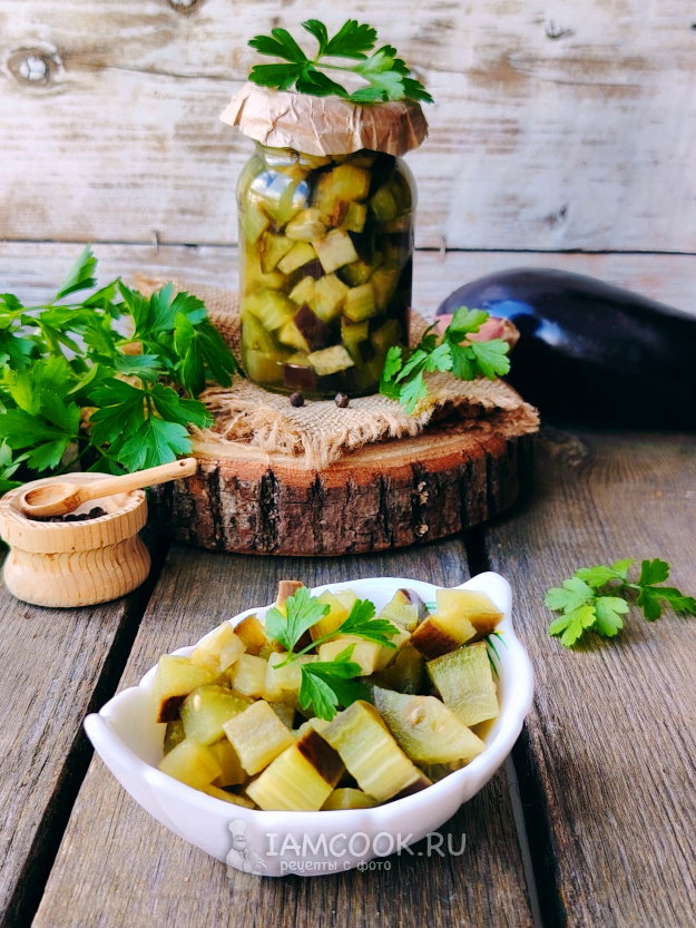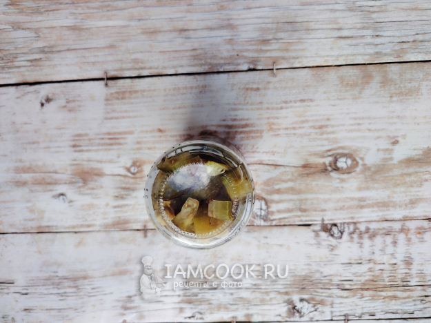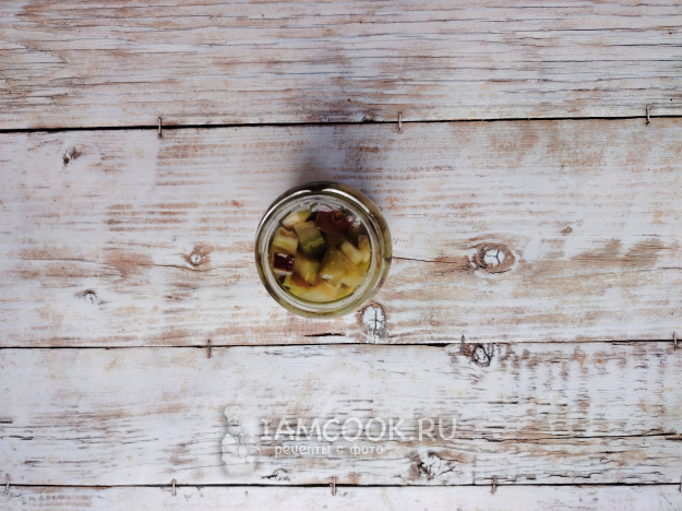 Наполнить стерильные баночки до плечиков баклажановыми кубиками, залить маринадом, чтобы он закрывал содержимое банок.
