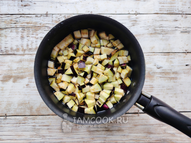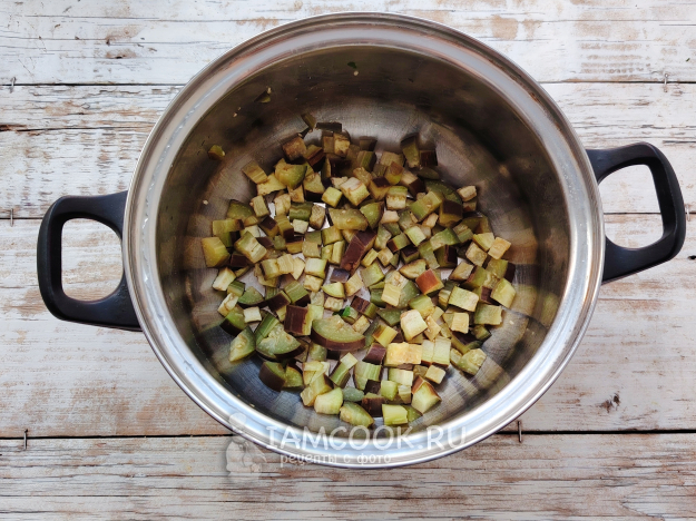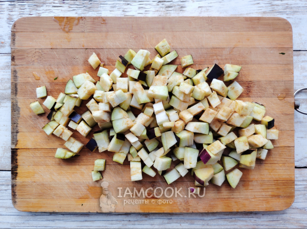 Баклажаны промыть под проточной водой, срезать кончики, мякоть нарезать небольшими кубиками.