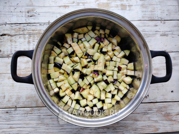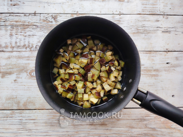 Слить отвар, залить свежей водой, снова поварить баклажаны в течение 5 минут. Слить воду, баклажаны можно откинуть на дуршлаг, чтобы жидкость полностью стекла.