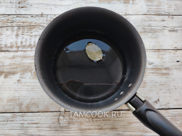 В другую посуду налить воду, добавить составляющие для маринада (половинку столовой ложки соли, сахар, лаврушку и перец).