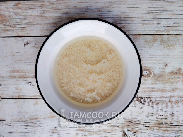Рис промыть, неоднократно меняя воду, залить свежей порцией воды, оставить на пару часов для набухания. Затем воду слить, крупу еще раз промыть.