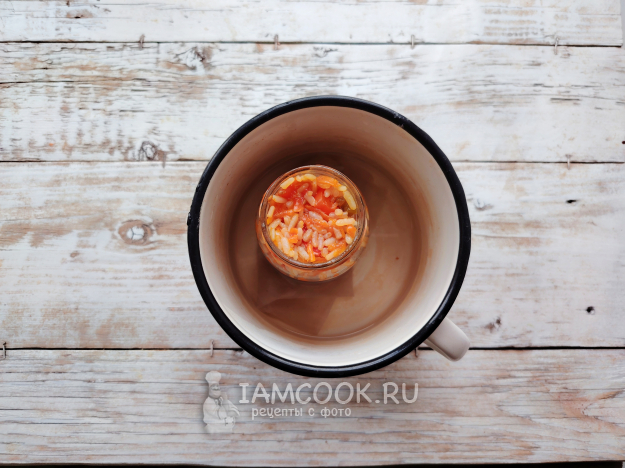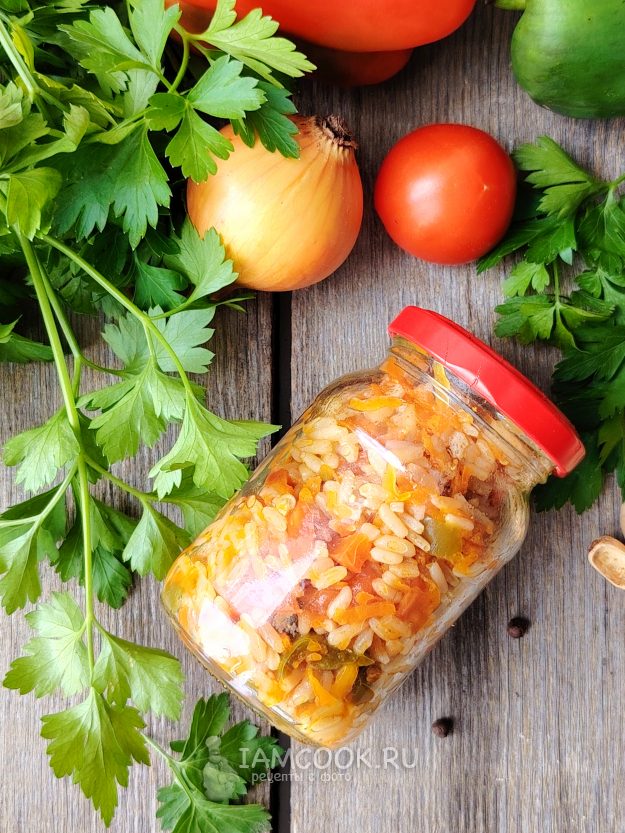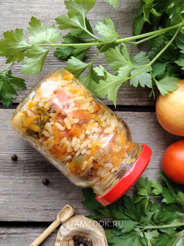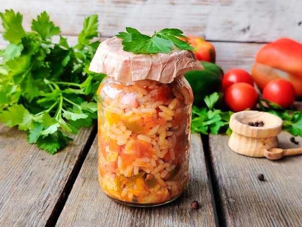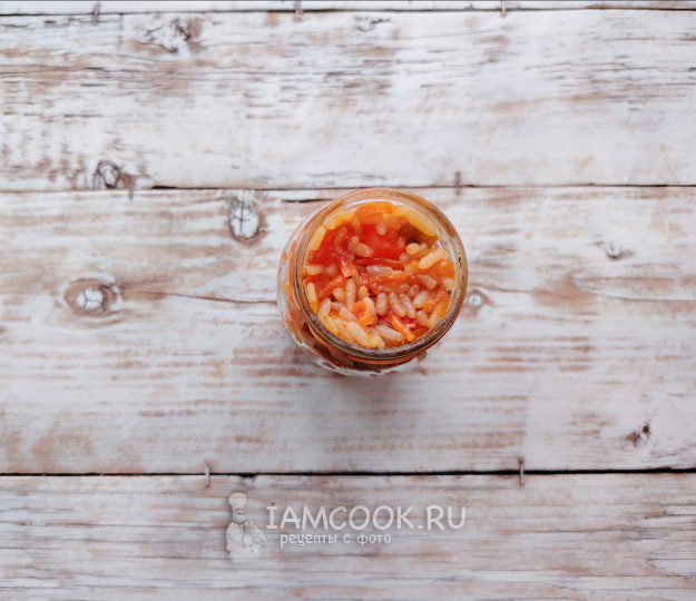 Разложить рис с овощами по стерильным банкам. Закатать сразу крышками. Поскольку заготовка содержит в своем составе уксус, дополнительно стерилизовать её необязательно.