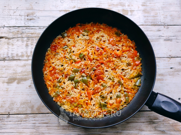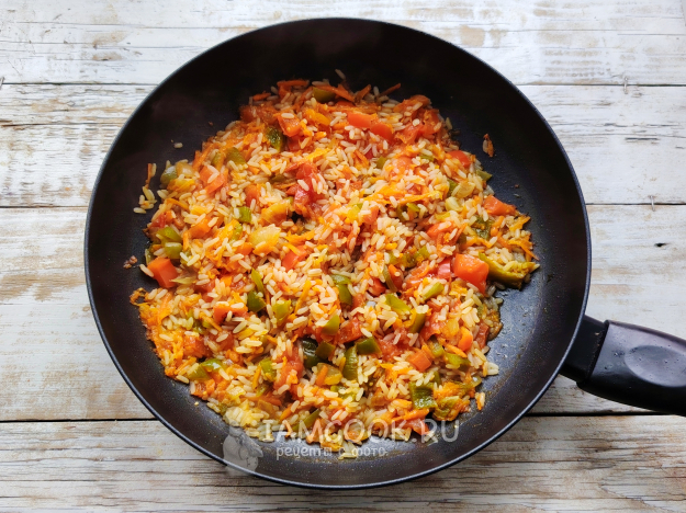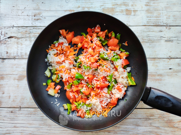 Овощи выложить в сотейник, перемешать, обжаривать их несколько минут, чтобы они пустили сок. Отправить к овощам рис.