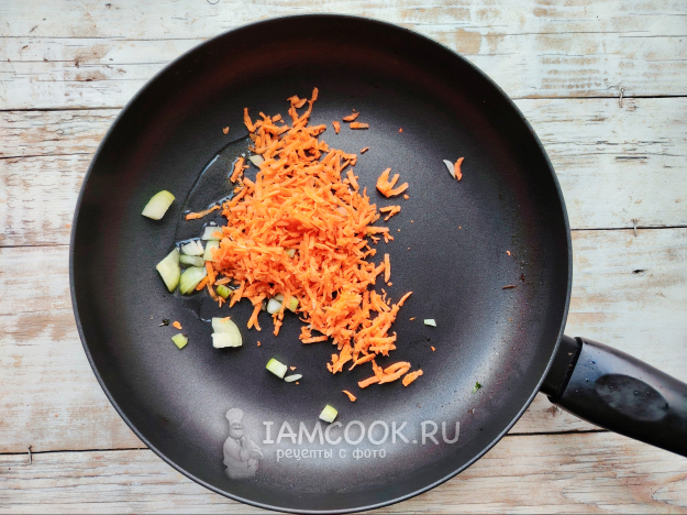 Следом к луку отправить натертую морковку. Перемешать, обжаривать в течение 3-4 минут на среднем огне.
