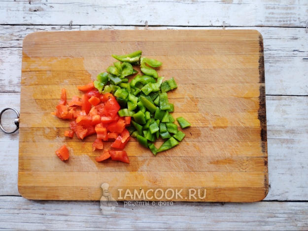 Тем временем подготовить остальные овощи. Болгарский перец помыть, удалить семенную коробочку, нарезать соломкой или кубиками. Для контраста можно взять разноцветные плоды.