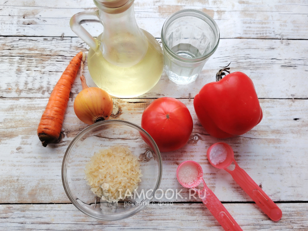 Соберите по списку продукты для приготовления "ризотто" на зиму в банках. Рис для такой заготовки лучше использовать длиннозерный, чтобы рисинки при длительном хранении в овощном соусе не превратились в липкую кашу.