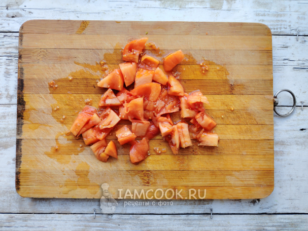 Томаты промыть, вырезать место крепления плодоножки. Мякоть также нарезать кубиками.