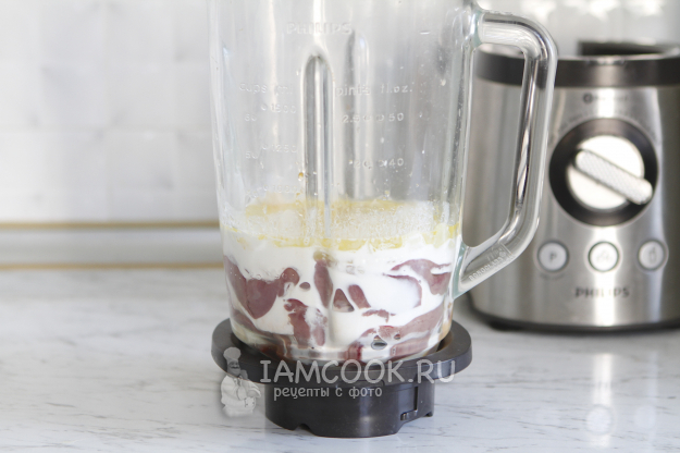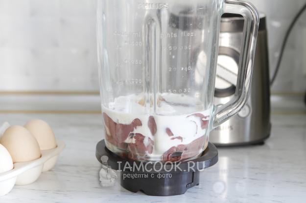 Переложите куриную печень в блендер. Введите два яйца и влейте сливки (я добавляла 11% сливки, можно и пожирнее).