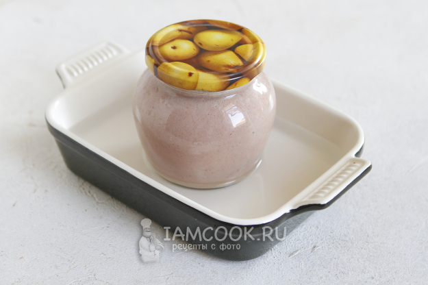 Банку установите в форму для запекания, закройте ее крышкой. Я просто прикрыла банку крышкой, не закрутив ее плотно, и в результате во время запекания у меня образовалась шапочка и у горлышка в банке появилась небольшая пустота. Этот момент, конечно, не критичный, но просто учтите, что такое может быть.